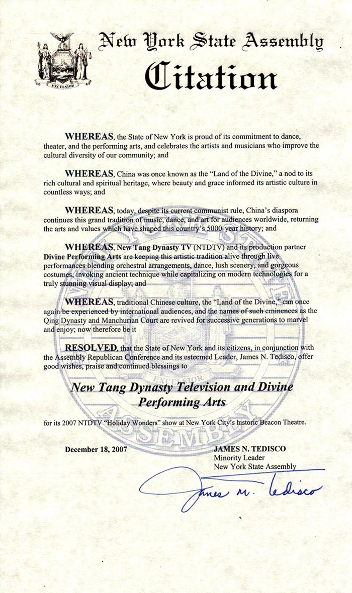 鉴于,如今,尽管共产党统治了中国,散居海外的华人却能以音乐、舞蹈和艺术的形式,向世人展现他们五千年悠久文化的光彩;并且,