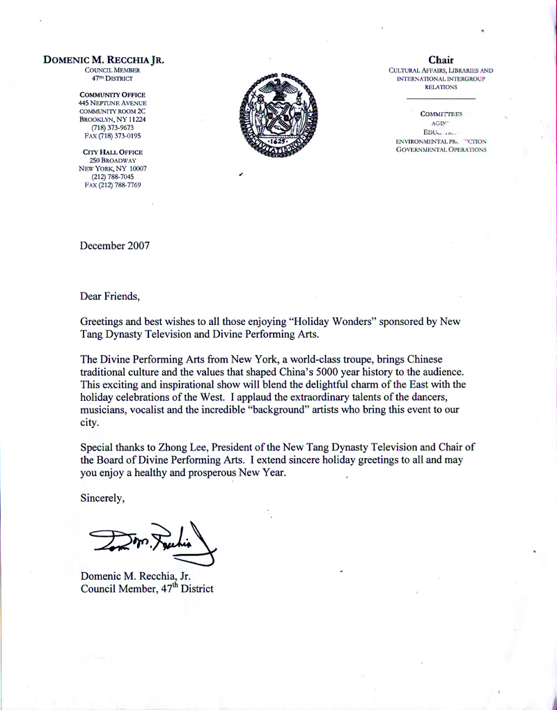![]() 纽约市议员多米尼克•瑞查的贺信 |