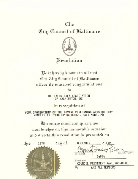 另外,马里兰州参议院及巴尔的摩市议会一致通过决议,以表彰神韵艺术团再现真正传统文化的精髓,为马里兰州和全世界人民带来人类尊严和积极的价值观。
