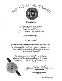 马里兰州参议院向神韵艺术团致以最诚挚的祝贺,以表彰你们再现和展示真正传统文化的精髓,以及为马里兰州和全世界的居民带来人类尊严和积极价值的庆典。