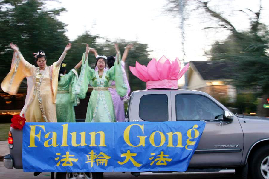 在社区游行队伍中,法轮功队伍的方阵前面是英文“法轮大法--真善忍”的横幅,后面是炼功队,小弟子手持炼功横幅,然后是花车,上面有四个身着唐装的“仙女”在炼功。看到法轮功学员慈悲祥和、功法优美,社区的市民都说:“太好了!”