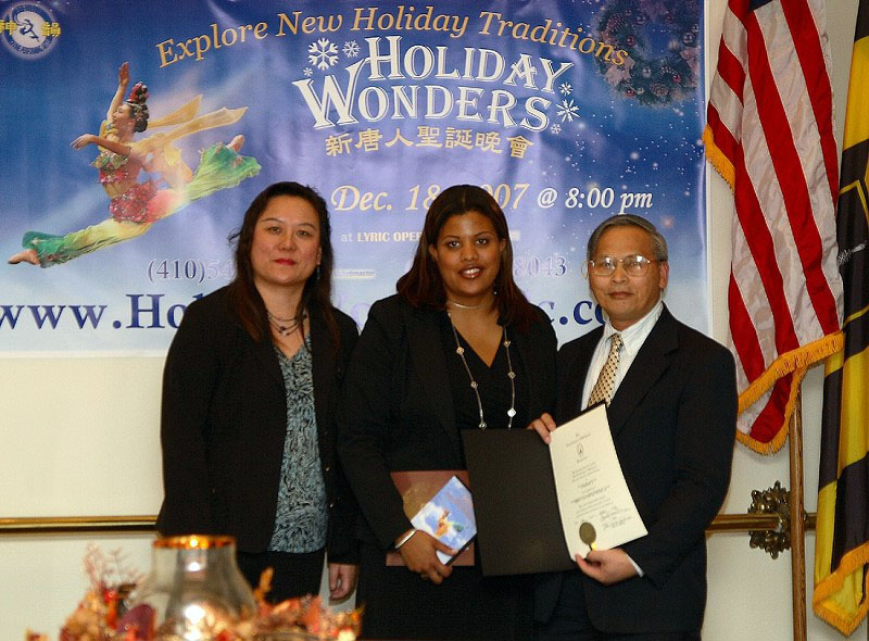 巴尔的摩市议会议长罗灵斯•布莱克女士在颁奖仪式上宣读了褒奖令。“巴尔的摩市议会向华盛顿DC法轮大法学会致以最衷心的祝贺,并表彰你们在马里兰州巴尔的摩市里瑞克剧院(LYRIC OPERA HOUSE)主办神韵艺术团圣诞奇观演出。在二零零七年十二月十八日这个值得纪念的日子,全体市议会成员表达我们最美好的祝愿。”