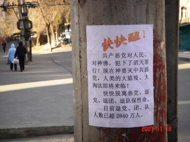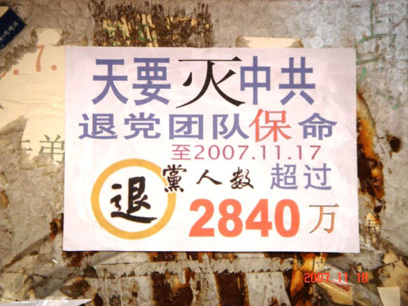 今年十月,在北方某大城市的电线杆、社区宣传栏、家属区的墙壁、防盗门上惊现大量张贴的或用大蜡笔写的标语和文章。内容包括「中共高级干部退党声明」、「中共沈阳市司法局党委书记、局长的退党声明」、「天津市公安局六一零郝凤军的公开退党(团、队)声明」、「原中国驻悉尼领馆一等秘书陈用林及妻子的退党声明」、「歌唱家关贵敏退党声明」、「教授的退队、退团声明」、「片警退出恶党了」、「警察声明」、「作为一名共产党员我感到非常可耻和失望」等。还有:「声援退党、团、队已超过二千八百万人!」、「天要灭中共,退党平安」、「快快醒!天要灭中共,三退保平安!」、「退党保平安」等。