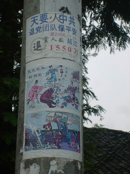 ![]() 东北农村田间地头的《九评》、退党传单 |