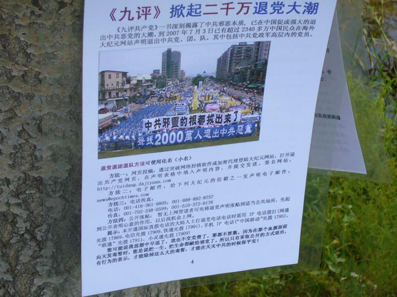 【明慧网二零零七年十二月二十一日】(接上文)二零零四年十一月,大纪元发表了《九评共产党》,由此引发了中国大陆涉及成千上万人的退党运动。截至二零零七年十二月份止,以真实姓名和化名宣布退出中国共产党及其相关组织的中国民众,已近三千万人之多。退党运动背后有大量志愿人员夜以继日、坚韧不拔的工作,一千多个日日夜夜的持续工作,其中成千上万的故事令人动容。这些默默无声的涓涓细流,终将汇成一个惊涛骇浪。