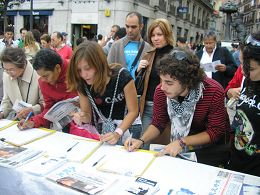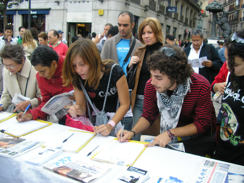 ![]() 九月二十九日,西班牙马德里退党服务中心在市中心的太阳门广场举办声援二千七百万中国人退出中共的征签活动。当地人和游客们在了解真相后排队等候签名支持退党活动 |