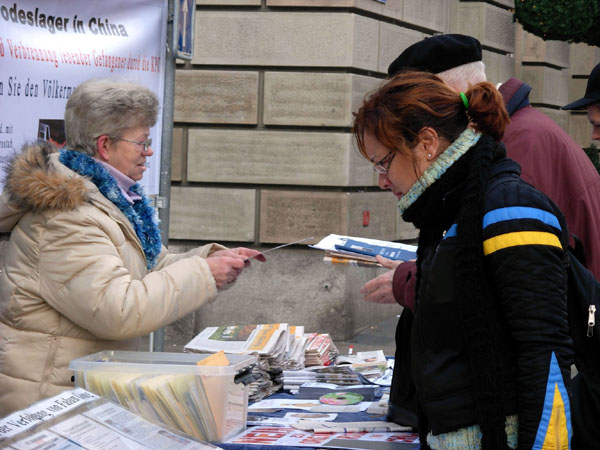 娜赫尔拿到法轮功学员分发的报纸后立即就翻看了起来,并向学员了解更多的真相。在离开前她签名要求制止中共活摘法轮功学员器官的罪行。此前她还没有听说过活摘器官的事情,只是知道在中共的统治下没有对人权的尊重。她觉的活摘器官非常糟糕,不是人的行为。在临走前她还拿了一份中文材料,因为现在她正在学中文,所以也希望把真相带给她的中国朋友。