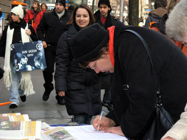 虽然天气寒冷,又是圣诞节前夕,很多路人都行色匆匆,但还是有不少路人驻足观看展板,或主动签名表示对法轮功学员的支持,或和学员交谈,向学员了解更多的真相。
