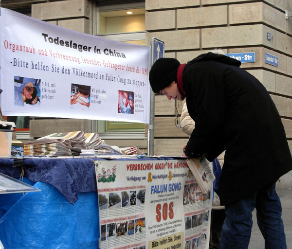 法轮功学员挂出醒目的揭露中共活摘法轮功学员器官的横幅,摆出各种从中国国内辗转传出的迫害真相图片。很多路人看到后马上就知道是法轮功的信息摊位。因为一年多来,每个月都可以在班霍夫大街上看到法轮功学员的身影。在信息桌上还放着各种语言的真相材料和签名表,有的是呼吁制止中共迫害法轮功,有的则要求瑞士政府及联合国调查并制止中共活摘法轮功学员器官。
