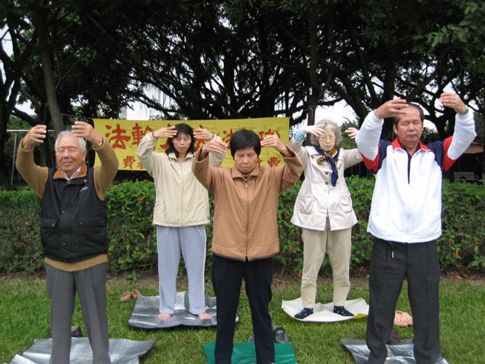 ![]() 郭伯伯每天风雨无阻参加永和福和桥运动公园炼功点的晨炼 |