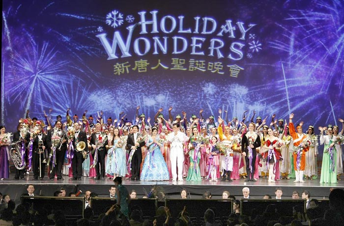![]() 新唐人纽约圣诞晚会演员于二零零七年十二月二十四日,平安夜下午场演出结束时全体演员谢幕。 |