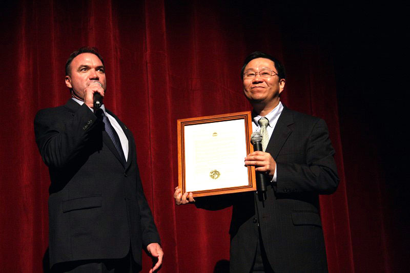![]() 大西洋城市长斯格特椰艾文斯(左)亲临剧院颁发褒奖给新唐人圣诞晚会, 新唐人电视台总裁李琮(右)接受褒奖。 |