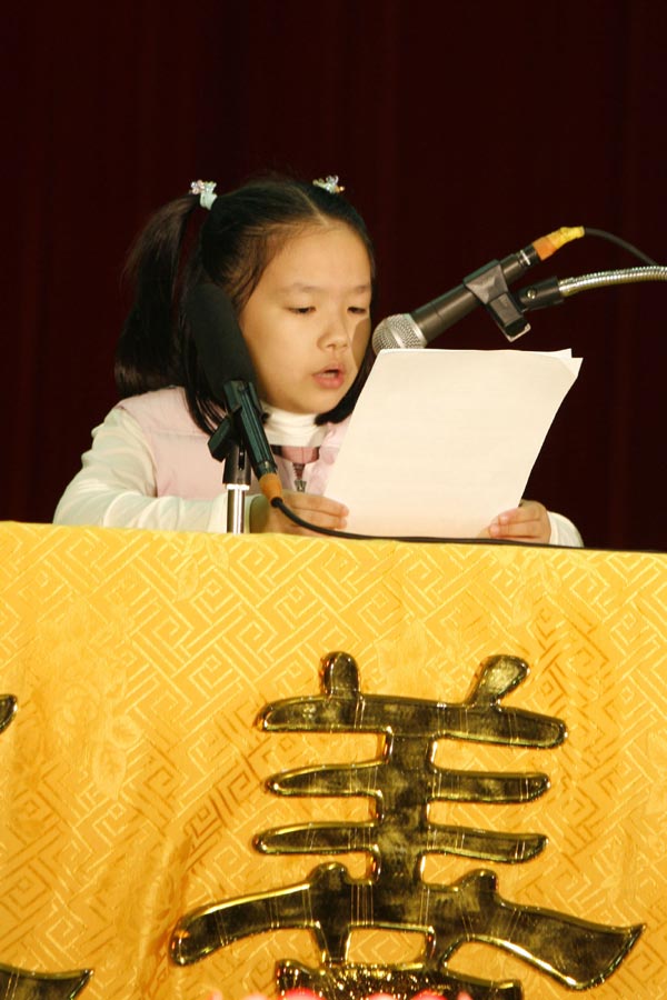 来自基隆的叶采曼今年九岁,小小年纪已经修炼五年,是上台发言年纪最小的法轮功学员。她说,四岁的时候,看到阿嬷在客厅放着音乐炼功,觉的很好玩,常常跟着比画比画,后来就要求阿嬷教她,从此每天跟着阿公阿嬷炼功、读《洪吟》。