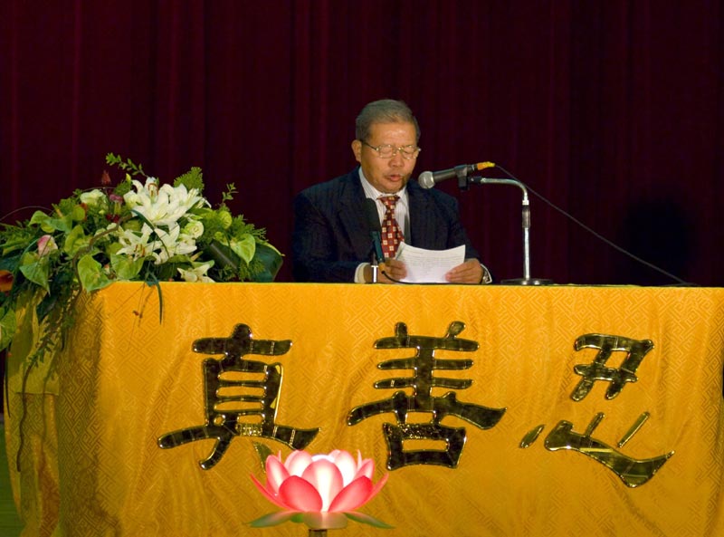 彭荣勋医师两年前曾罹患肺癌,手术后,经朋友赠送《转法轮》一书,阅毕,感觉自己已经找到寻觅已久的路,遂前往中兴大学炼功。走过艰辛的初学阶段,两个多月后竟发现白发变黑,身体状况明显改善。今天参加法会,他期望能在修炼路上更加精進。