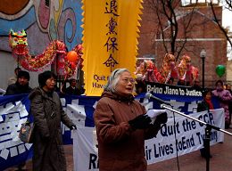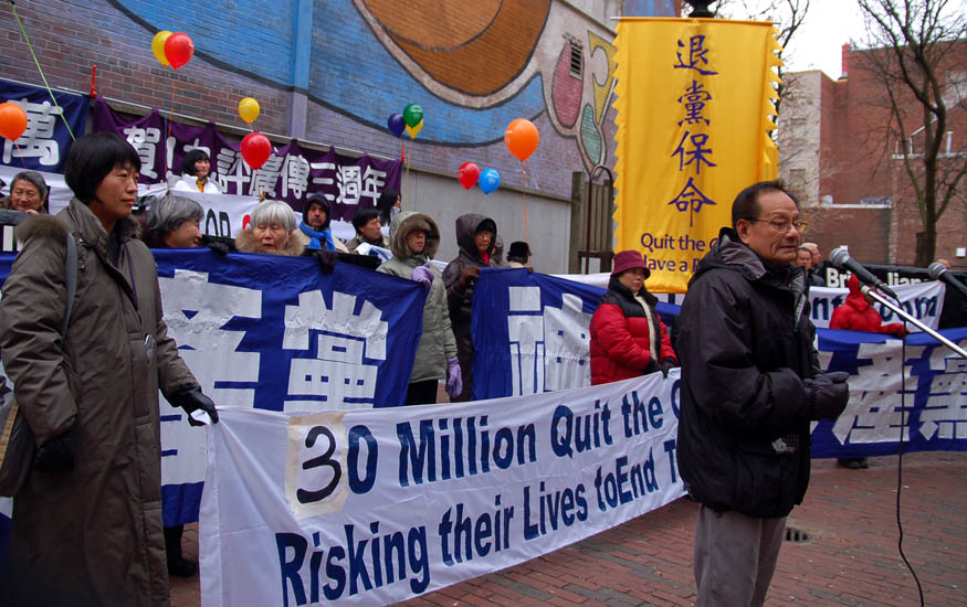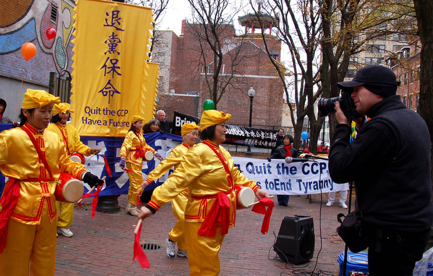 十二月二日中午,在波士顿中国城,「天灭中共」、「退党保命」、「九评神威」等横幅标语遍及中国城楼牌公园;腰鼓表演和大合唱吸引了路人驻足观看。同时,集会现场播放了电视录像、退党电话录音,将退党、退团及退队的故事及喜悦分享华埠人士。