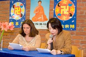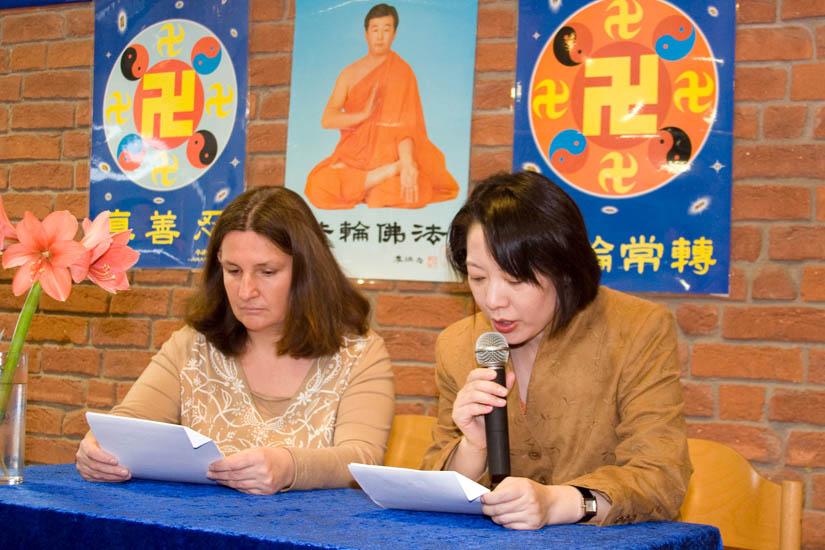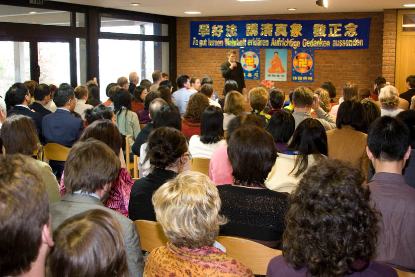 法会首先由来自柏林的Erika•Zhang女士和大家就参加新唐人电视台的节目制作和参与筹办二零零七年新唐人全球华人新年晚会和大家交流了她的修炼心得。作为有全职工作的公司职员,张女士把所有的业余时间和每年的休假时间都用在了新唐人的节目制作、采访等工作上,经常需要工作到深夜。对她来说,时间上的挑战和心性上的考验都很大。
