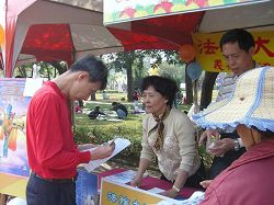 ![]() 「法轮大法」摊位上,民众索取资料并了解大法的美好及迫害的残酷。 |