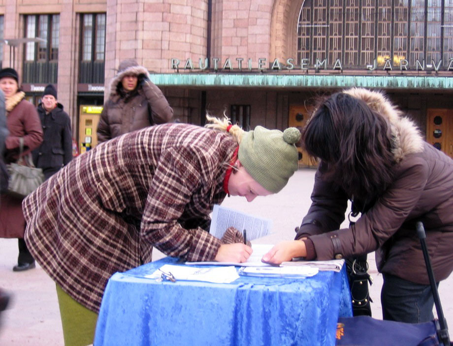 冬日的赫尔辛基寒风阵阵,冻的人们紧缩脖颈匆忙赶路,但活动地点用英文播放的《九评共产党》和中、芬文的“天灭中共 退党保命 声援2900万人退出中共”横幅及法轮功受迫害真相展板和横幅,却吸引来不少民众直奔征签桌前签名声援。