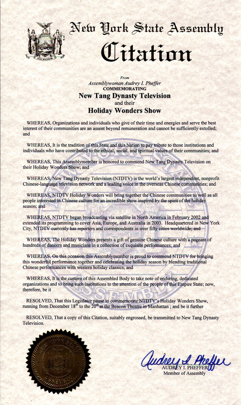 鉴于,本议员在此很自豪的表彰新唐人电视台,表彰他们编排出这一美好的演出,并溶合传统的中国表演与西方古典节庆于一体庆祝佳节;并且