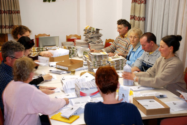 ![]() 在一天的信息日结束后,法轮功学员会在住所集体学法,并为第二天准备发送的材料 |