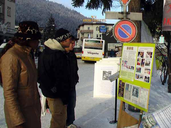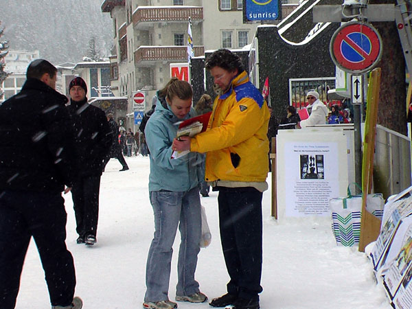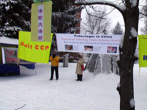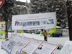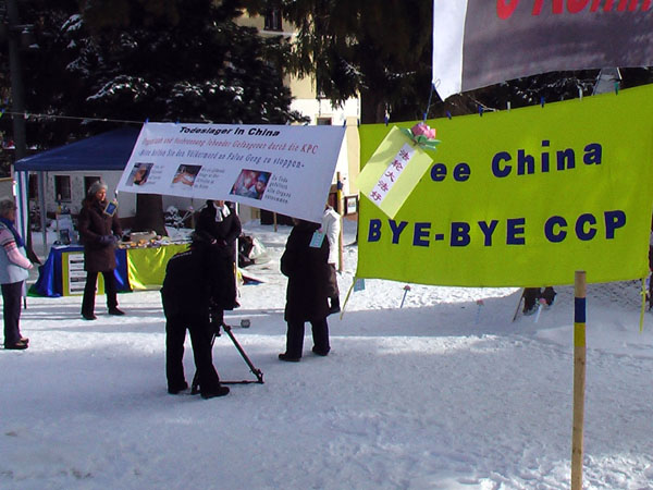 周三,经济论坛正式开始,各界人士再次聚集到达沃斯,当然也吸引了上百家媒体。信息摊位上悬挂的各种横幅,路边展出的关于法轮功学员受到迫害的展板,以及关于《九评共产党》的英德文简介也被记者们一一收入镜头。一家墨西哥电视台在去年就曾报道过法轮功学员的信息摊位,今年再次长时间摄像并采访了学员。法轮功学员当然也利用这一机会,通过各国媒体告诉世界:请关注正在中国发生的这场非人的迫害和越来越受支持和关注的退党大潮。
