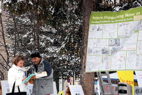 一位当地学校的老师告诉法轮功学员,本来打算在她的班级周三来滑雪时将学生们都带到信息摊位来,但是因为雪崩警报,集体滑雪被取消,不能成行。但是她已经将报纸发给每个学生了。当她翻阅签名板时,她高兴的说,班里大部份学生都已经签名了。