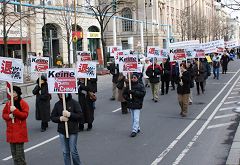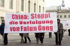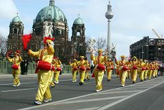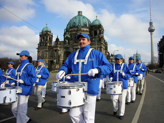 【明慧网二零零七年二月十四日】二零零七年二月十一日,德国首都柏林菩提树下大街上阵阵洪亮的乐曲声吸引了过往的人们。这是由法轮功学员组成的欧洲天国乐团在柏林首次展现风采。“法轮大法好”的旋律和“停止迫害法轮功”的横幅告诉了人们游行队伍的主题,也引起了人们对中国人权问题的关注。