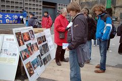 下午,法轮功学员聚集在西部柏林中心纪念教堂边的广场向来往的人们讲述真相。寒冷的天气挡不住过往人们了解真相的愿望,有的驻足观看欧洲天国乐团,有的找到学员深入了解。主持人告诉大家,这雄壮的乐曲后面有关于法轮大法的无限美好及其在中国大陆被无辜迫害的无数悲壮故事。
