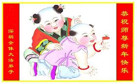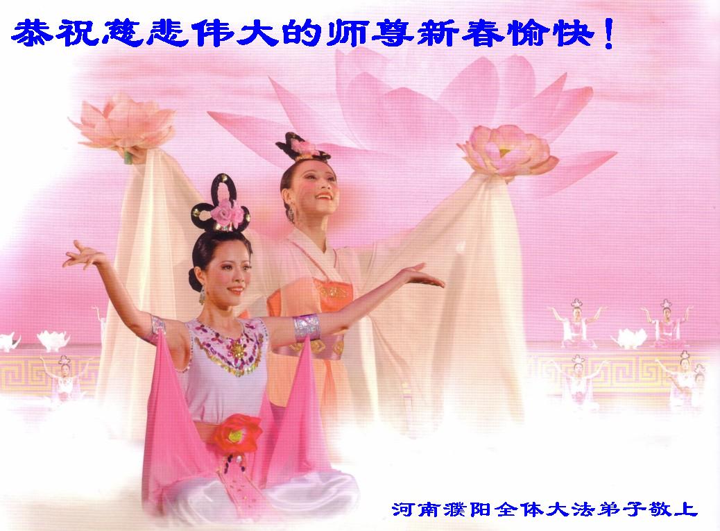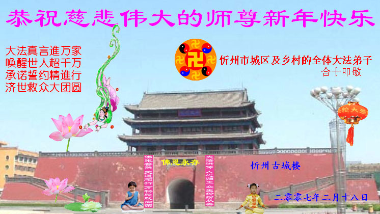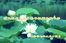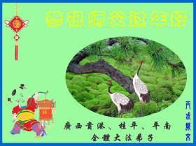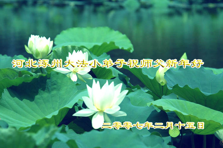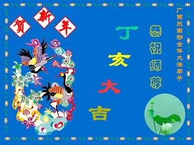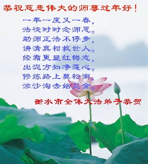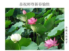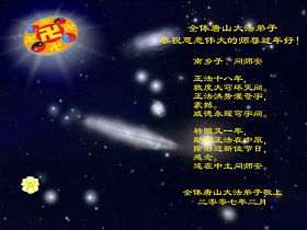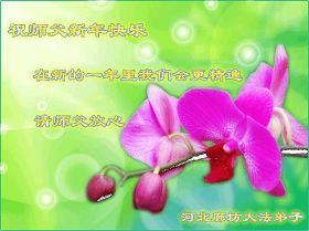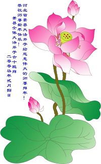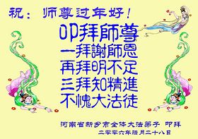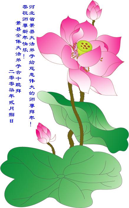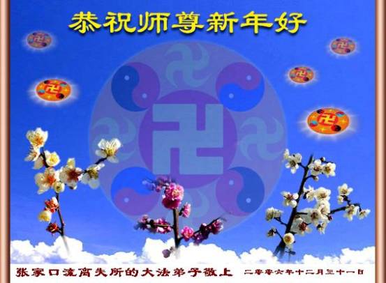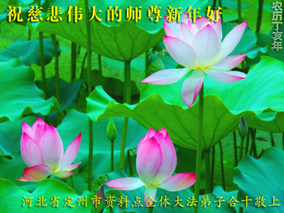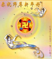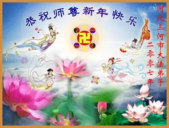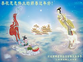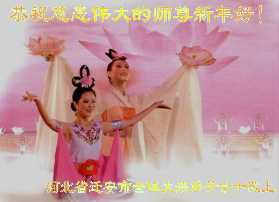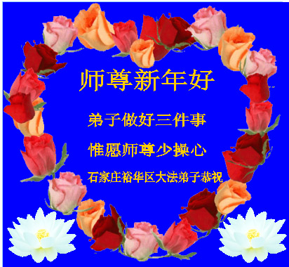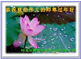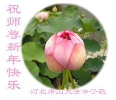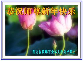 河北省煤炭系统部份大法弟子代表河北省内的开滦、峰峰、邢台、井陉、兴隆矿务局、邯郸煤矿设计院、邢台煤炭研究所、河北煤田地质局、煤田地质队、物测队、原河北省煤炭厅、石家庄煤矿设计院、(涿州市内)煤田地质局、物探研究院、邯郸市、邢台市、石家庄市(主要是井陉县)、保定市(曲阳县、涞水县等)、张家口市(蔚县、张北县等)、唐山市、承德市等地煤矿系统大法弟子,以及邯郸矿院、石家庄煤校、唐山矿院教职工及学生大法弟子、所有河北省内与煤炭相关职业的大法弟子,向我们的尊师拜年:师父,新年好!