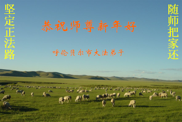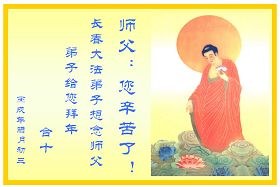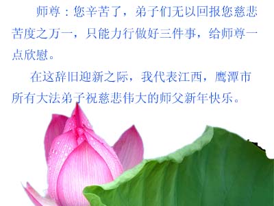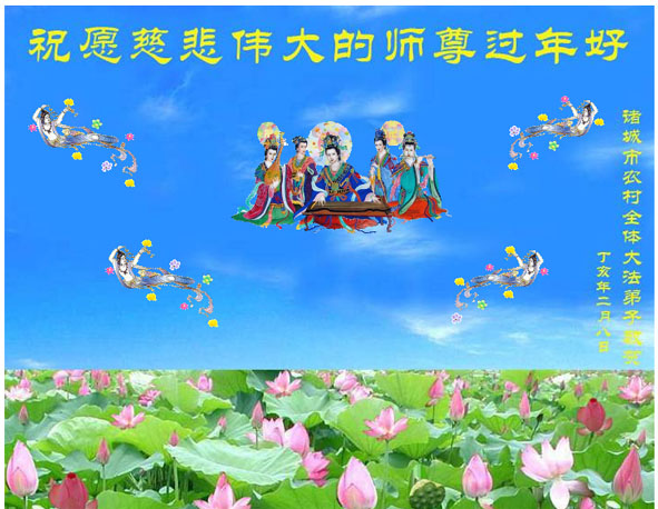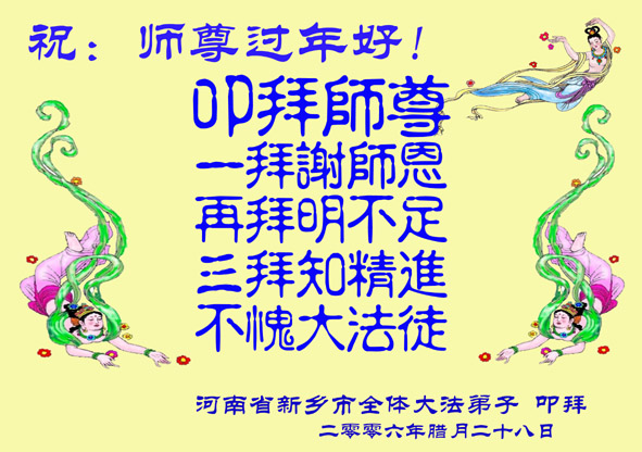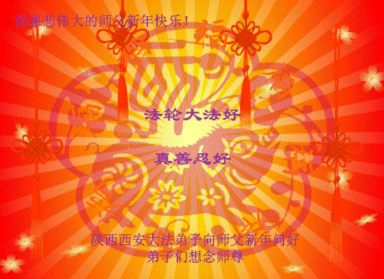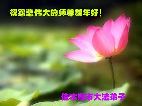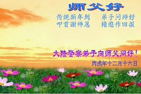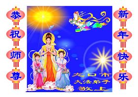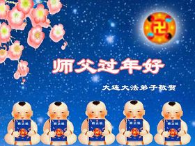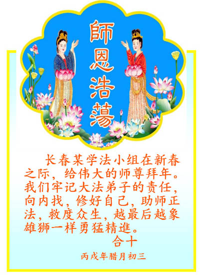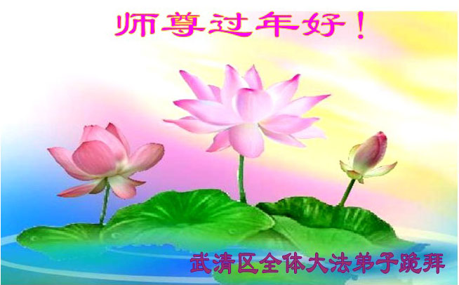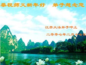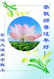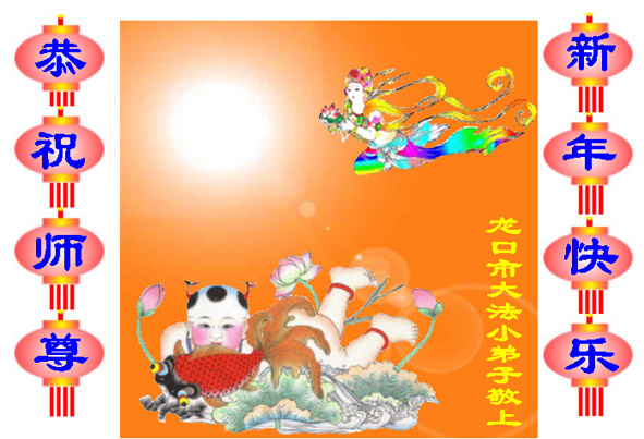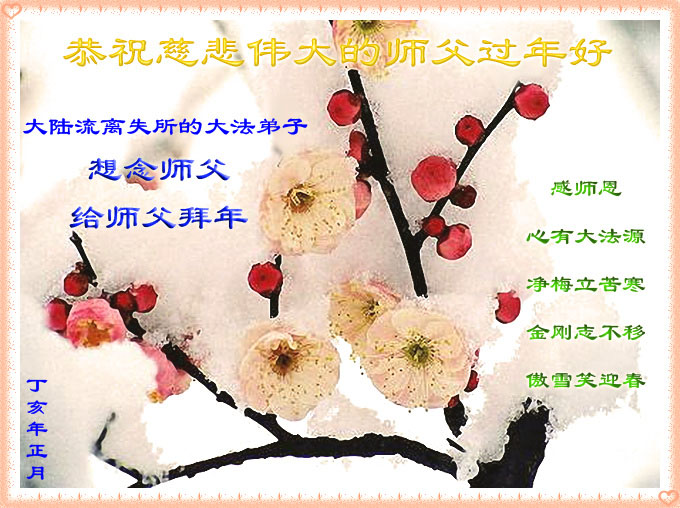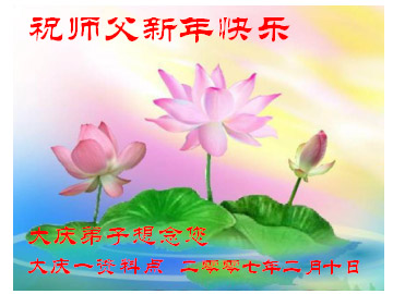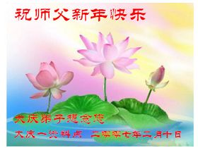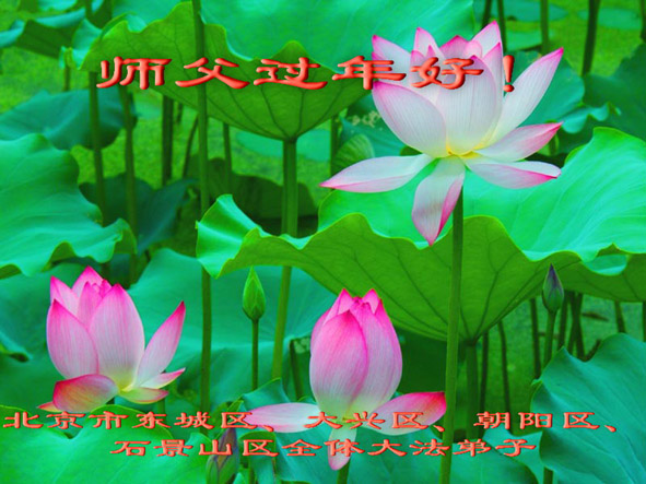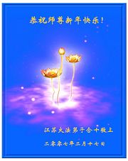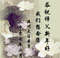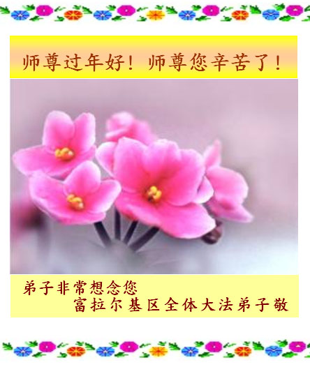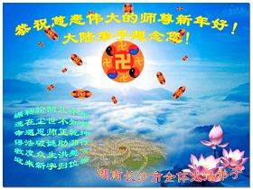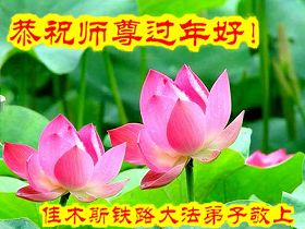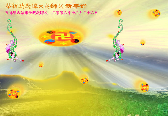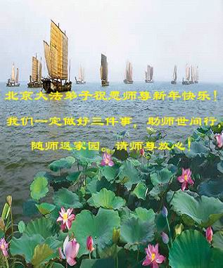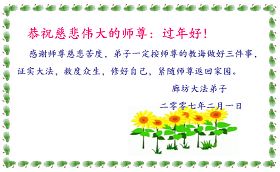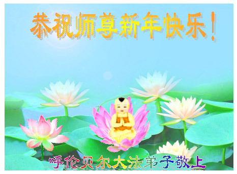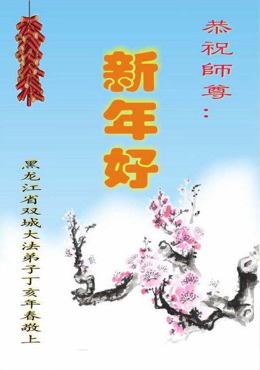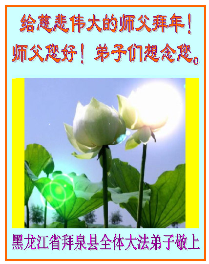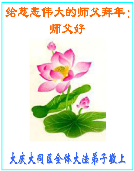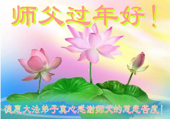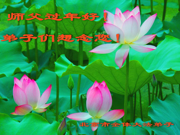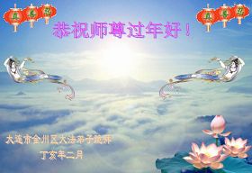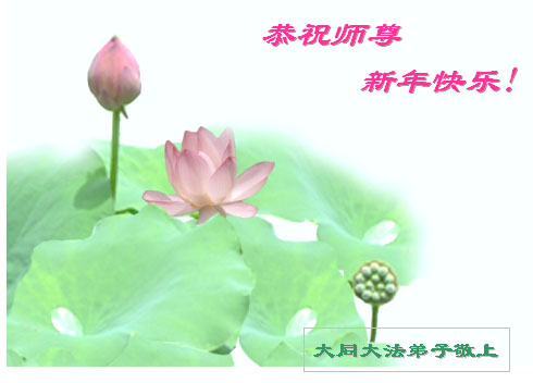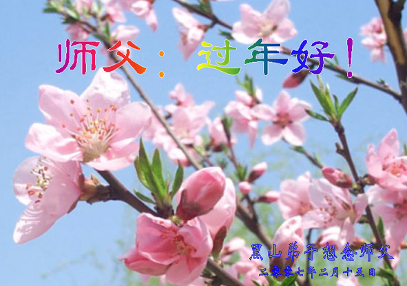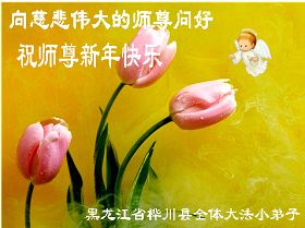 师父:您好!在此新春佳节来临之际,谨代表大陆新闻系统大法弟子叩拜慈悲伟大的师尊:师父过年好!师父辛苦了!大陆大法弟子想念您!盼望和师父团聚的那一天!我们一定做好三件事,不辜负师父的慈悲救度!