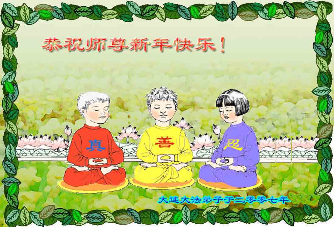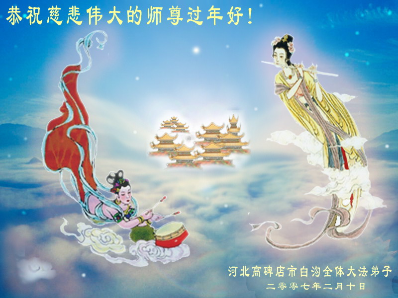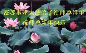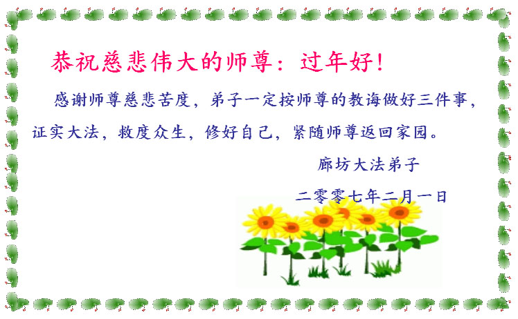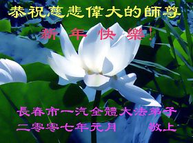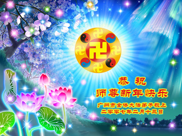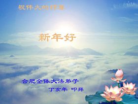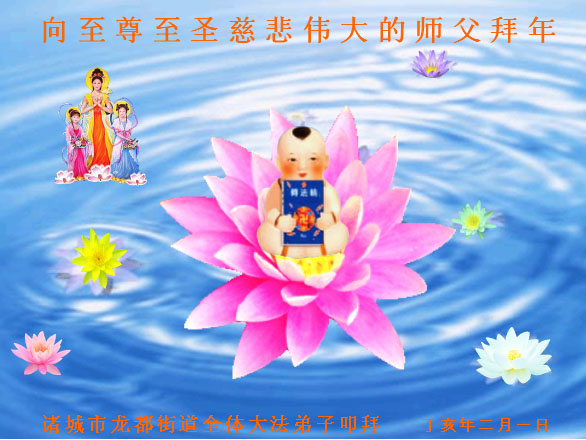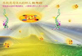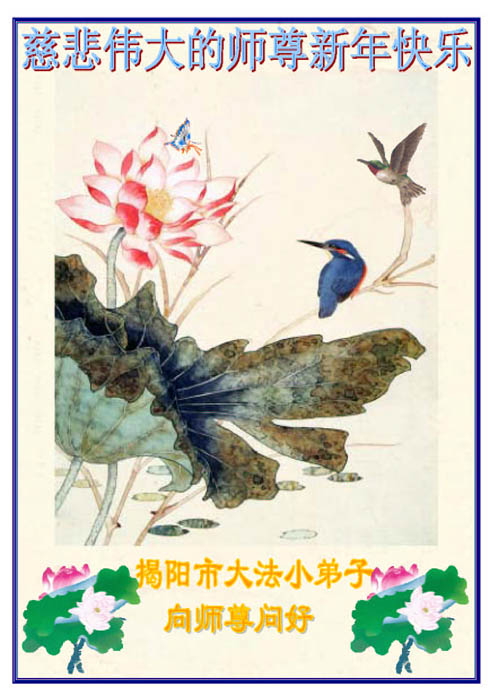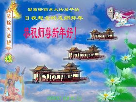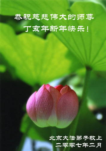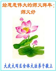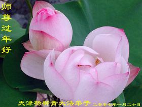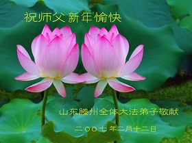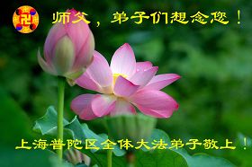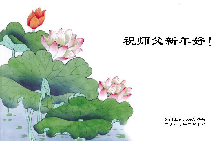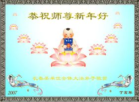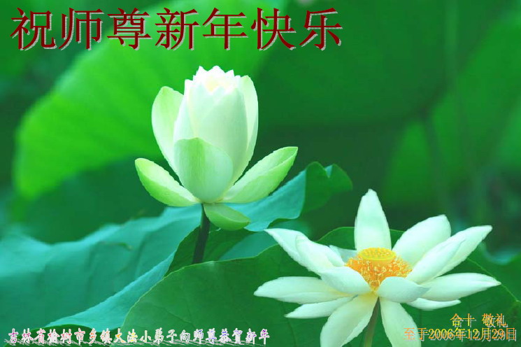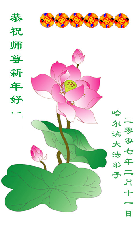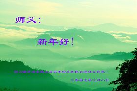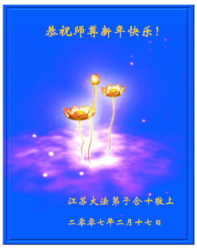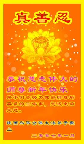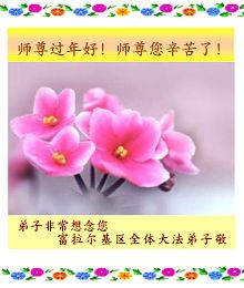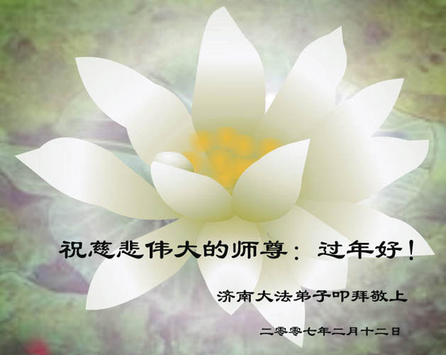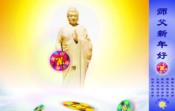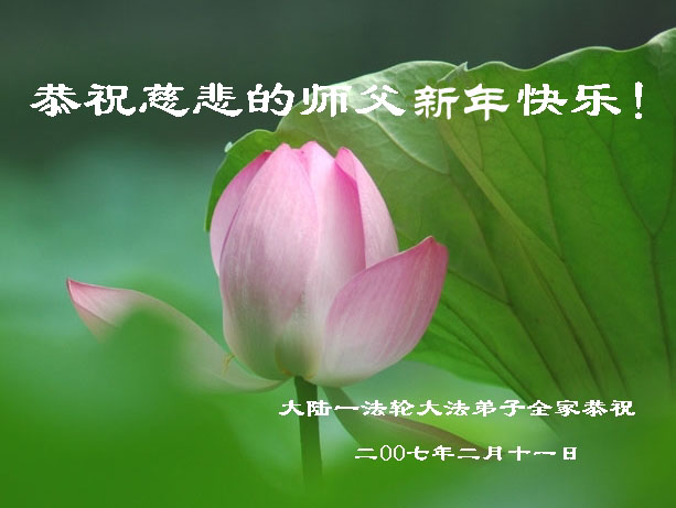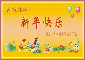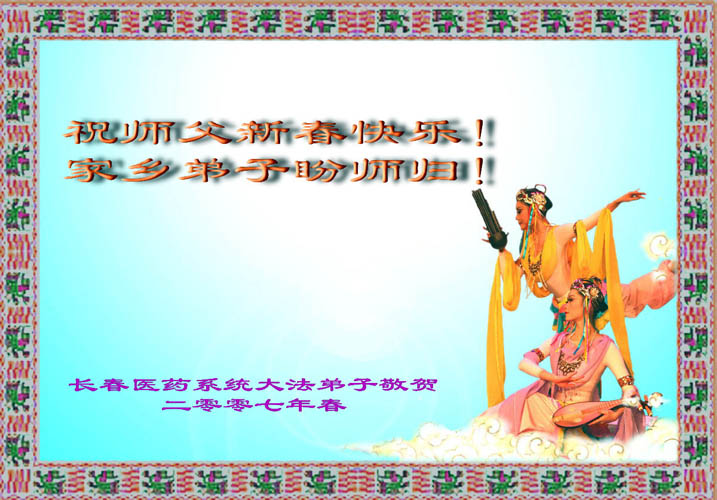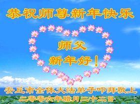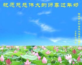 师父:您好!在此新春佳节来临之际,谨代表大陆新闻系统大法弟子叩拜慈悲伟大的师尊:师父过年好!师父辛苦了!大陆大法弟子想念您!盼望和师父团聚的那一天!我们一定做好三件事,不辜负师父的慈悲救度!