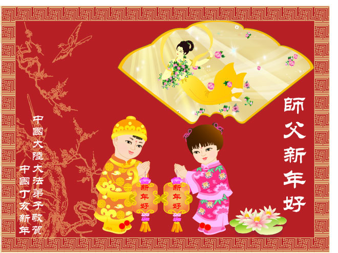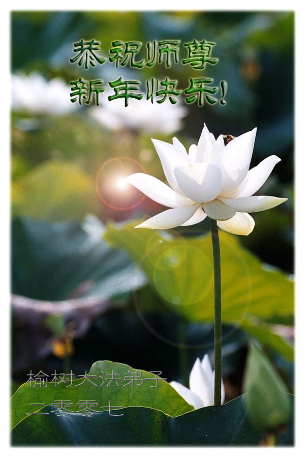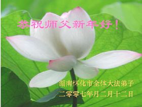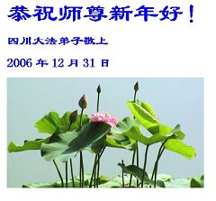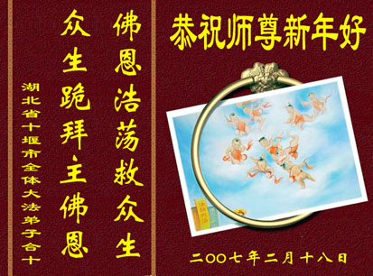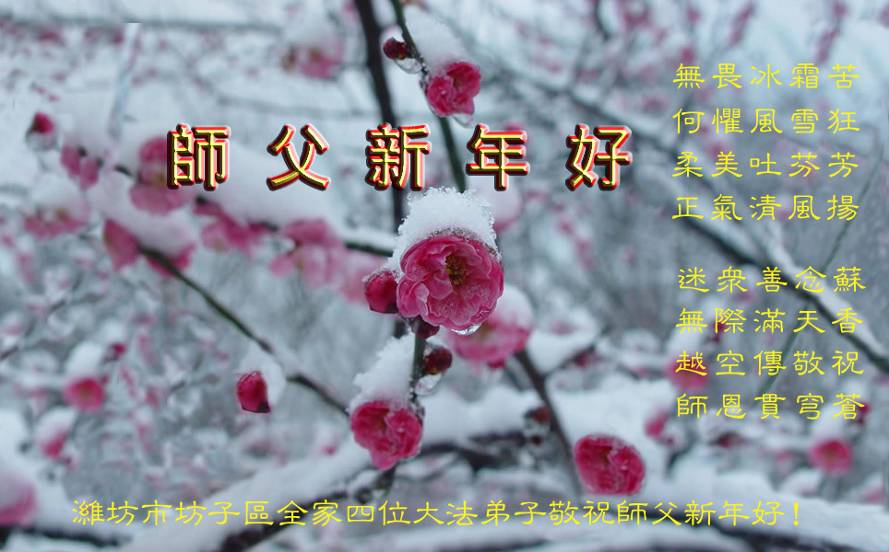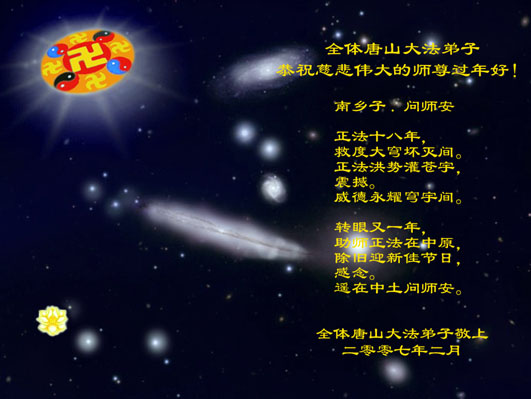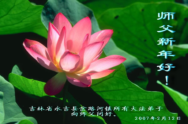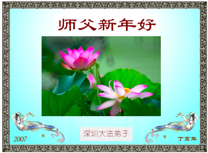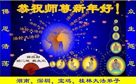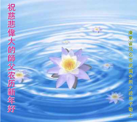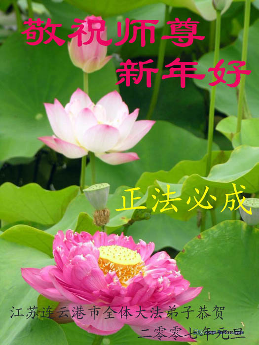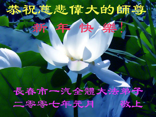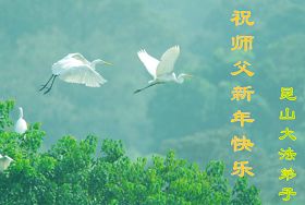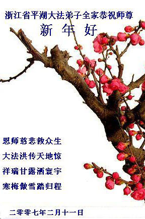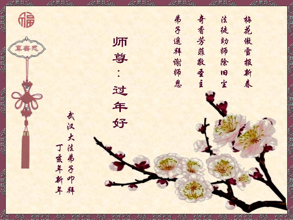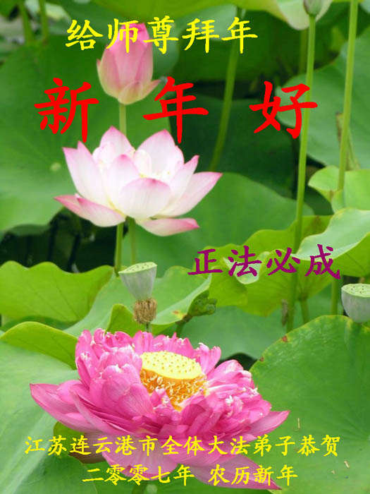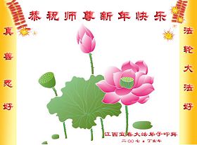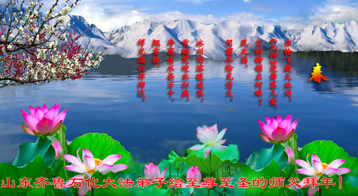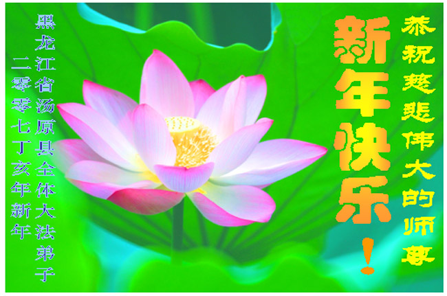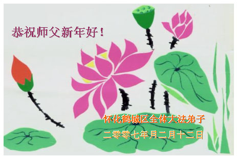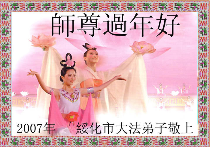 师父:您好!在此新春佳节来临之际,谨代表大陆新闻系统大法弟子叩拜慈悲伟大的师尊:师父过年好!师父辛苦了!大陆大法弟子想念您!盼望和师父团聚的那一天!我们一定做好三件事,不辜负师父的慈悲救度!