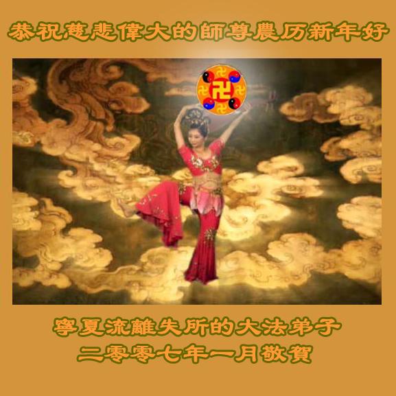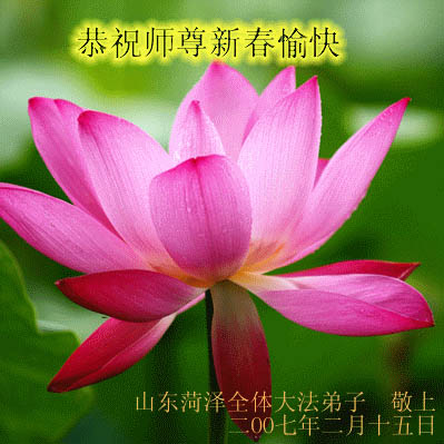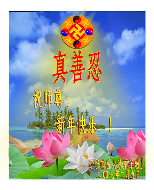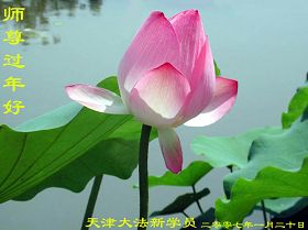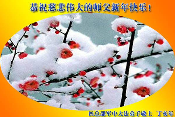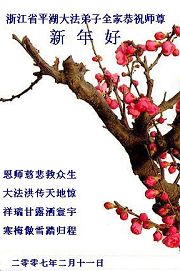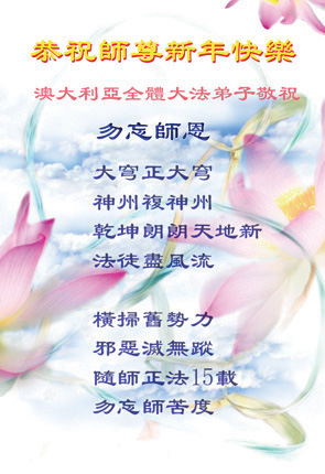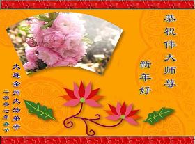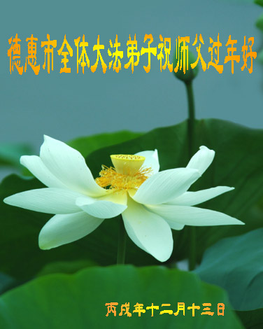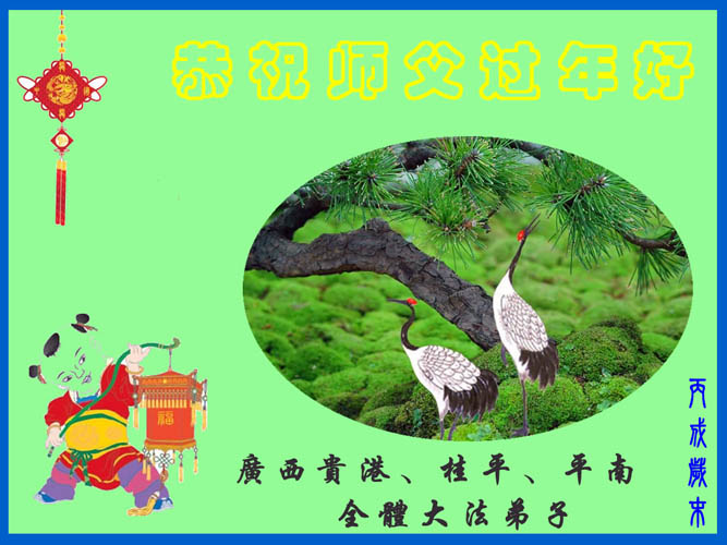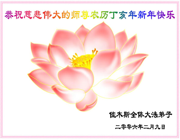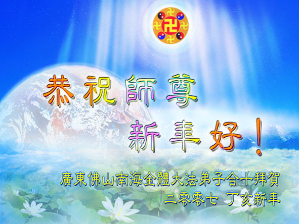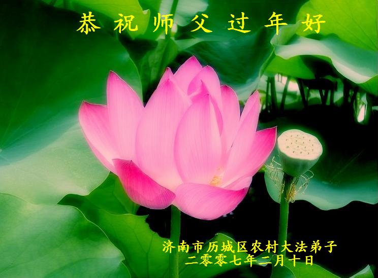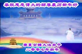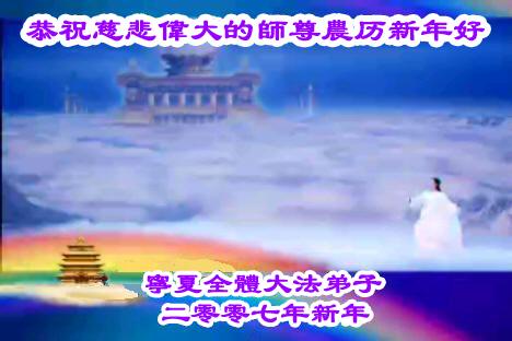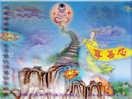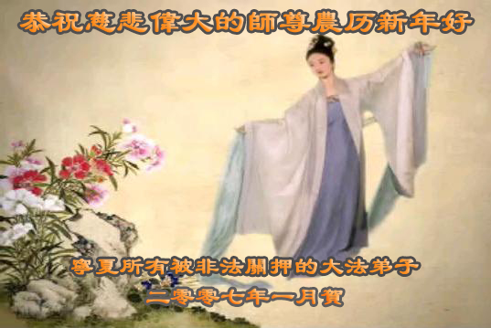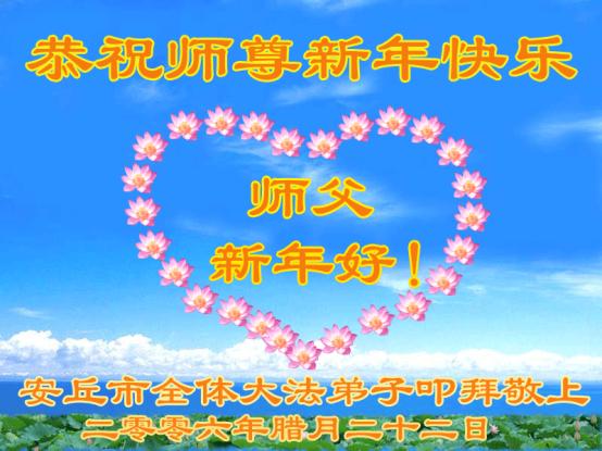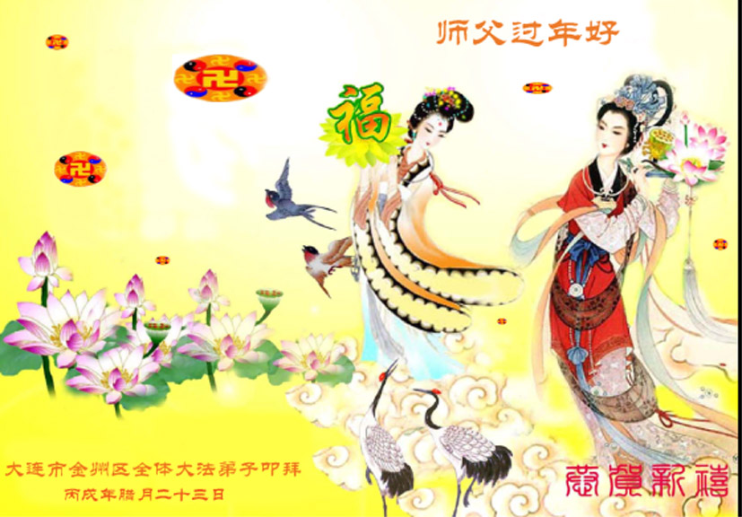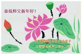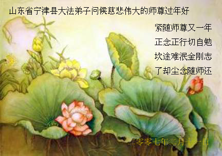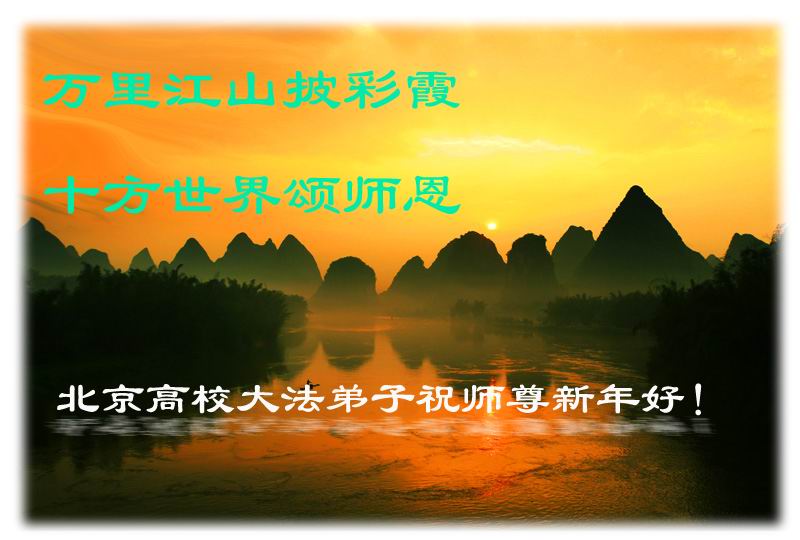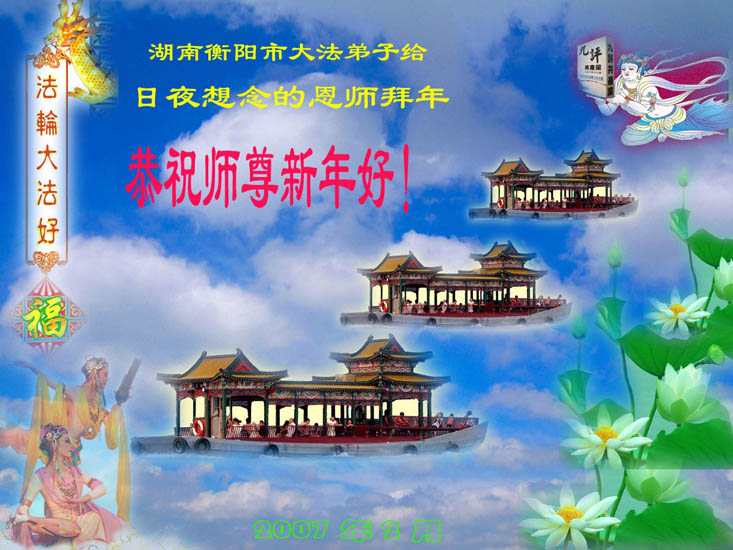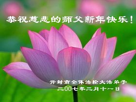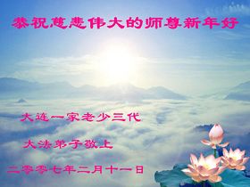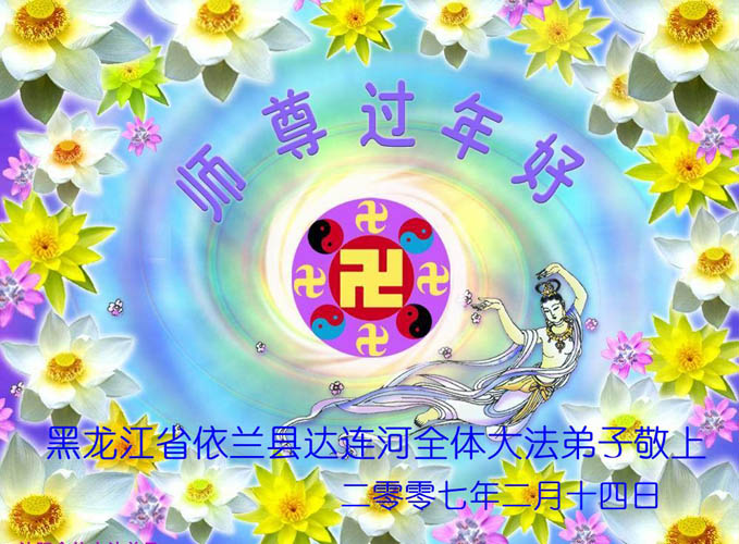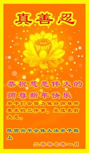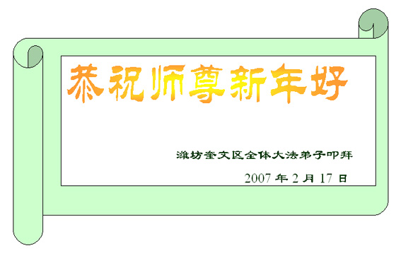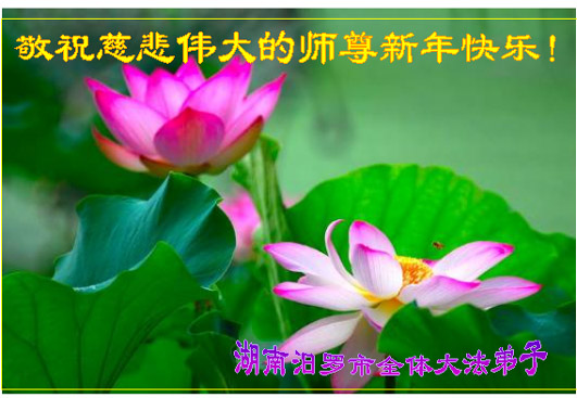 师父:您好!在此新春佳节来临之际,谨代表大陆新闻系统大法弟子叩拜慈悲伟大的师尊:师父过年好!师父辛苦了!大陆大法弟子想念您!盼望和师父团聚的那一天!我们一定做好三件事,不辜负师父的慈悲救度!