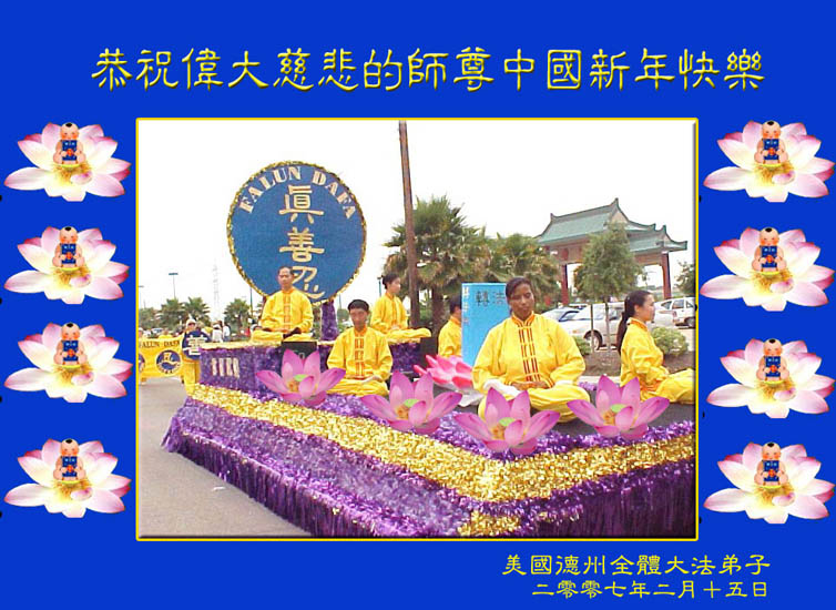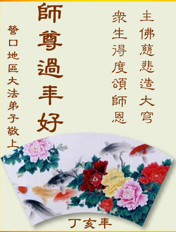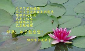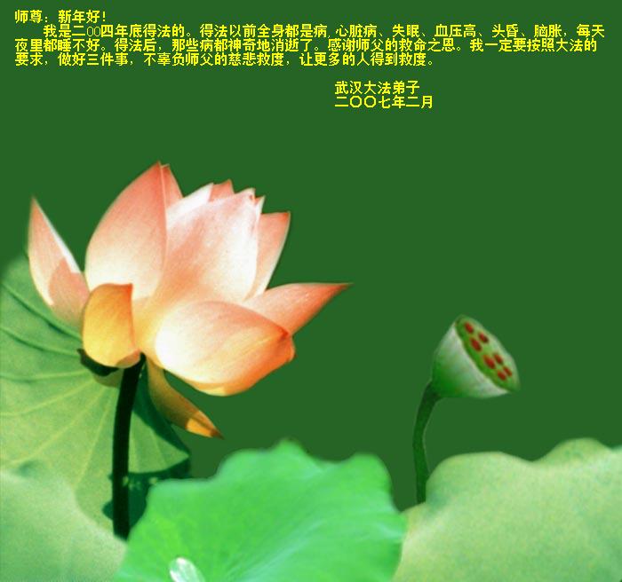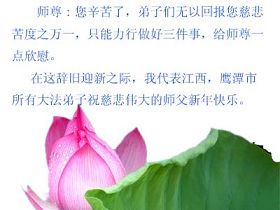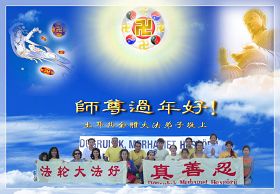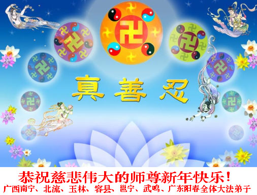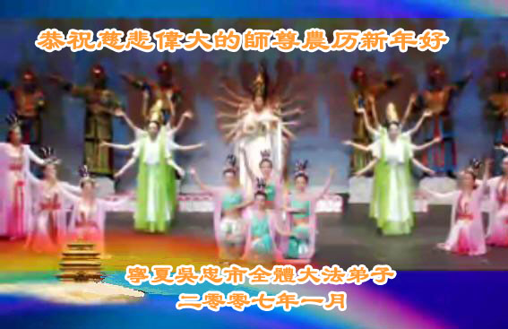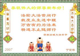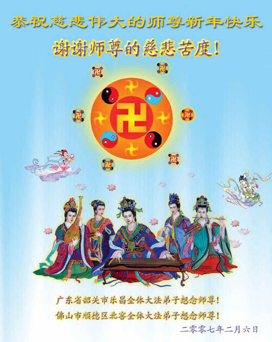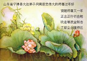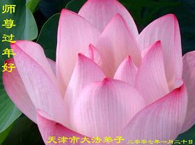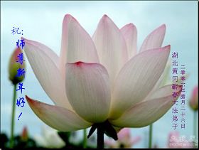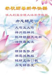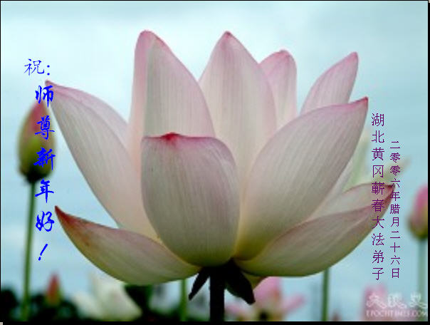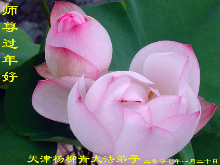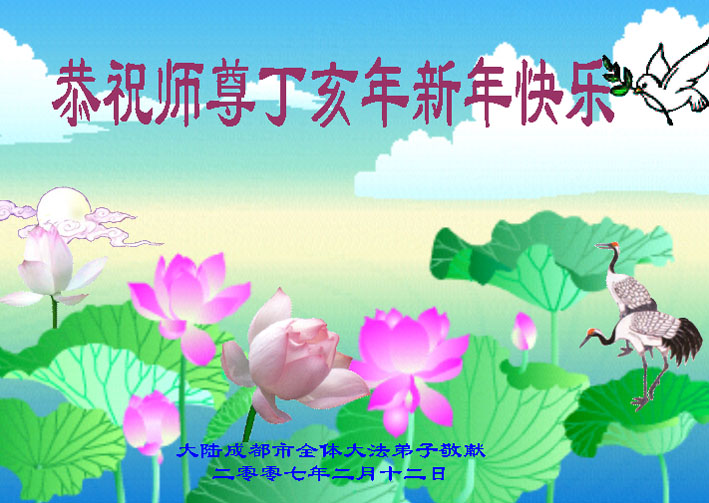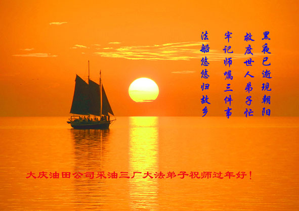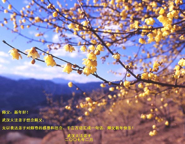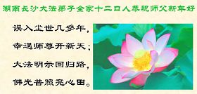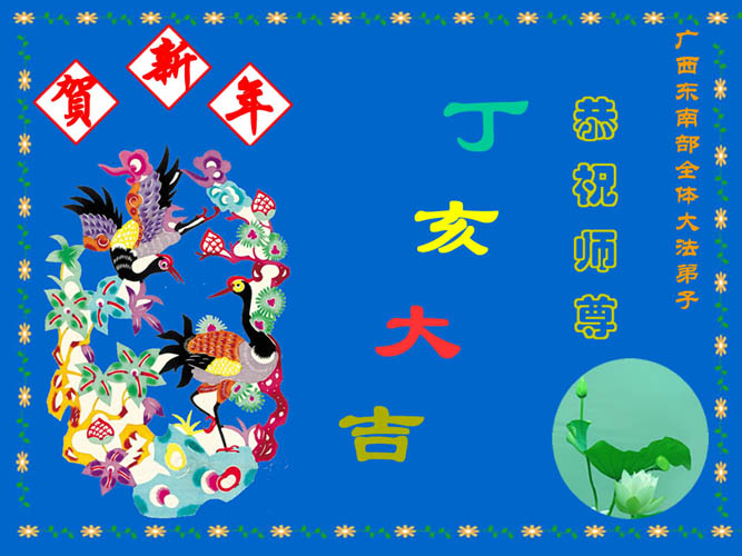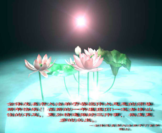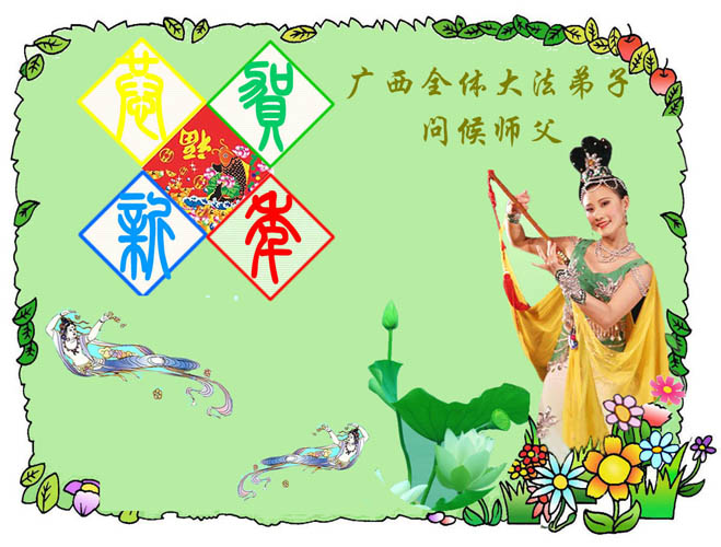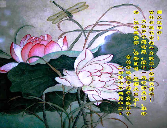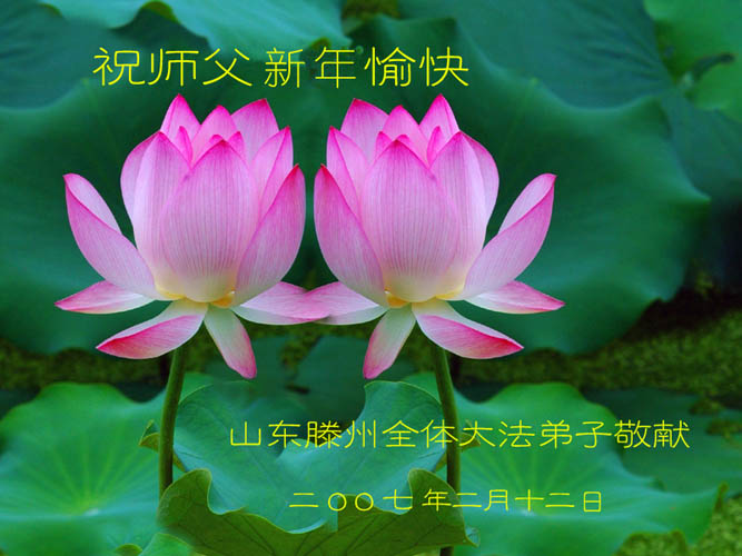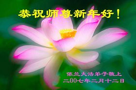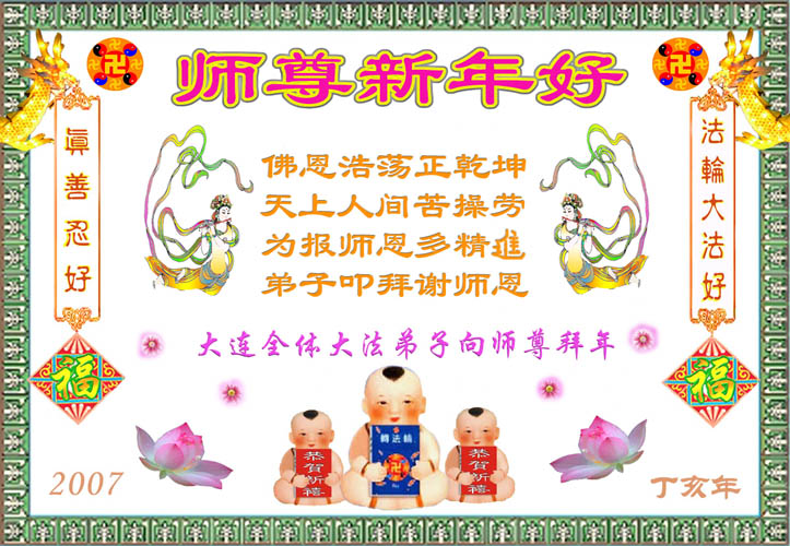 师父:您好!在此新春佳节来临之际,谨代表大陆新闻系统大法弟子叩拜慈悲伟大的师尊:师父过年好!师父辛苦了!大陆大法弟子想念您!盼望和师父团聚的那一天!我们一定做好三件事,不辜负师父的慈悲救度!