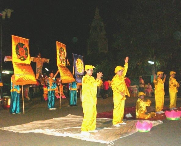法轮功学员演示了功法、龙旗、腰鼓、唱歌,以及优美的舞蹈「梅」、「仙女舞」等精彩的节目,展现了法轮大法的美好和修炼者的风貌,获得了阵阵掌声。由明慧学校的小弟子们表演的歌舞「大法小弟子」,纯洁可爱,天真活泼,给全场增添了欢乐的气氛。法轮功学员还当场教观众唱「法轮大法好」,并祝大家新年快乐。现场气氛非常溶洽。