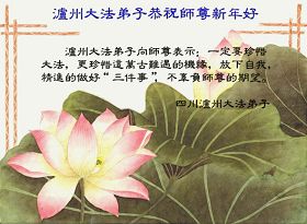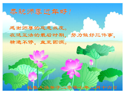 师父您好!弟子一定更加精進,努力做好三件事,在这有限的时间中,抓紧救度世人,兑现自己的史前誓约。弟子一定加倍努力,助师正法,但愿师父能少一分操劳。在此给慈悲伟大的师尊拜年!