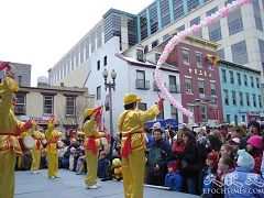 今年有大约二十个团体参加了游行,古装美女、舞龙舞狮、爆竹贺喜、腰鼓乐队,还有挥舞彩旗的儿童骑单人滑轮车表演。游行队伍中阵容最庞大的当属法轮功队伍,除了舞龙、舞狮、唐装仙女外,几十名身着金黄色服装的法轮功学员组成的腰鼓方阵,伴随着“法轮大法好”的歌声,个个精神抖擞、意气风发,博得沿途观众的喝彩和掌声,让街道沿途的观众目不暇接。