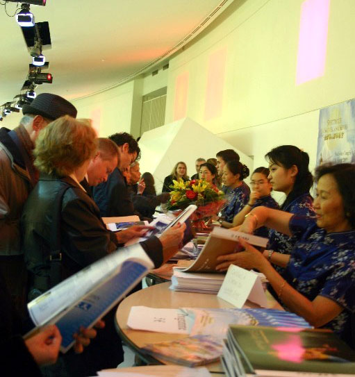 ![]() 晚会结束,观众仍依依不舍,争相购买晚会相册、DVD。(章乐摄影) |