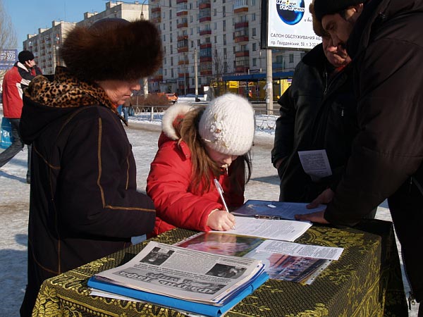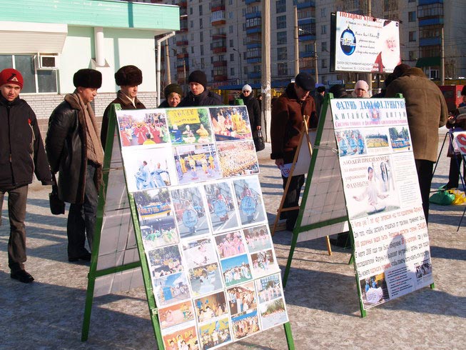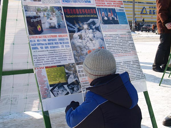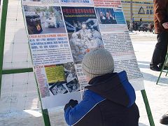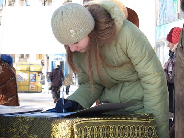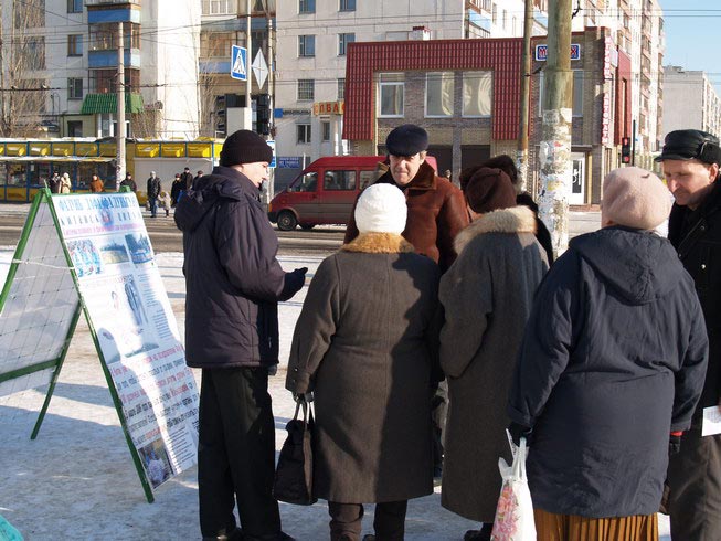 乌克兰的二月正值严寒的冬日,据天气预报报导举行活动的当天有大雪。可是在举行活动的四个小时之内,天气不仅不冷也没有下雪,而且有太阳。学员刚到达活动地点,还没来得及把横幅打开、展板放好,已经围上了很多行人,纷纷询问活动情况。学员边准备活动,边给那些询问者们讲述中共如何活摘法轮功学员器官以牟取暴利。得知真相后,人们纷纷签名谴责中共的暴行。