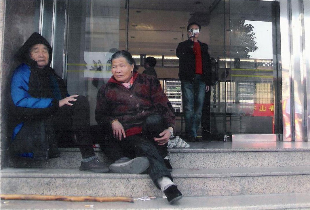 广东佛山大法弟子李继常被绑架后,家人连续几天到城区公安局要求无条件放人。相片为李继常父母在广东佛山国安门前要求无条件释放被非法抓捕的儿子。(图中拿相机照相者为国安便衣,企图通过拍下的照片继续加害其家属和围观群众。)