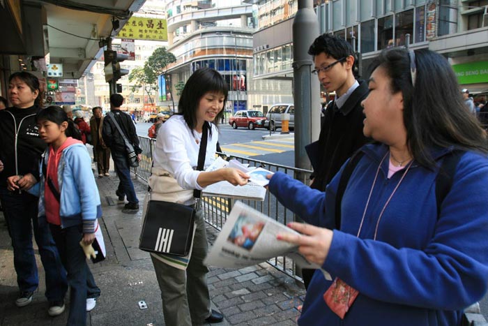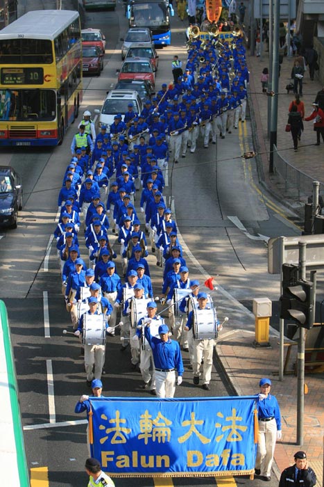 ![]() 台湾天国乐团走过港岛区的繁华闹市。 | ![]() 法轮功学员手持横幅,呼吁世人快快找真相。 |