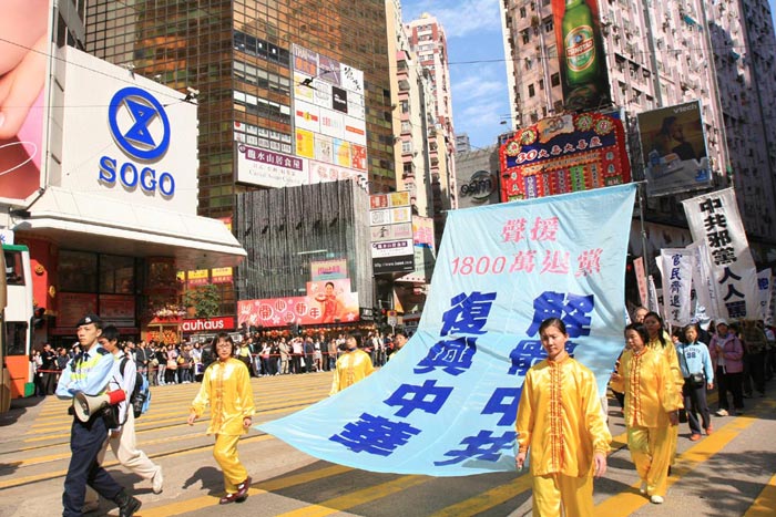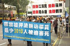 ![]() 参与游行人士要求释放被非法关押的法轮功学员及法办中共恶首。 | ![]() 游行队伍走过铜锣湾的繁忙街道。 |