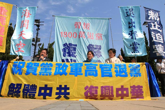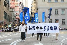在游行前的集会上,香港退党服务中心的代表指出,大陆社会各界对如何解体中共提出一些新的形式,该中心亦接获不少人士要求以真名实姓退出中共组织,这一切皆预示中共邪党解体的必然性,而“传九评、促三退”唤醒世人是代价最小收益最大的天赐良方。