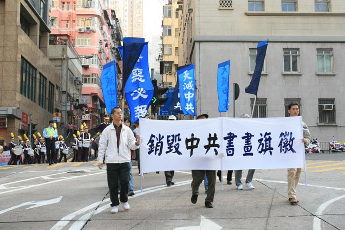 游行队伍由维多利亚公园起步,他们手持各种横幅标语,表达对中共种种恶行的控诉,声援及呼吁中国大陆官民各界退出共产党。继上一次游行在九龙区扬威后,台湾的天国乐团首次在港岛区亮相,奏起雄壮的乐声,领在游行队伍的前头,沿途吸引大批民众驻足观看,许多人都由衷的感到高兴。