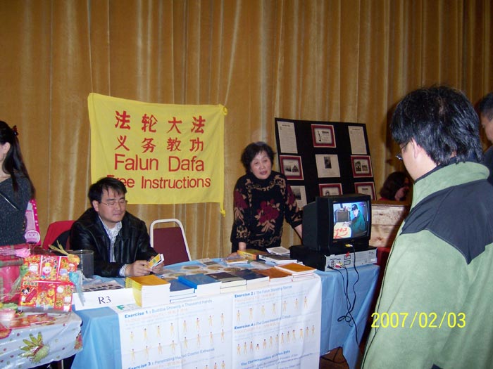 二月三日星期六,法轮功学员一早就将展台布置好,以迎接游客的到来。“法轮大法,义务教功”的黄色横幅十分醒目,台桌上摆放有多语种法轮大法书籍及免费的相关资料,一台不断播放法轮功真相的电视吸引游人驻足。人们川流而过,不再见到往年曾出现过的游人侧目,甚至冷言相向的镜头,更多的是会心一笑,带走一本《修炼的故事》或其它资料。