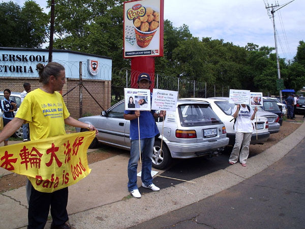 法轮功学员打出抗议标语及“法轮大法好”的横幅,并向维护治安的警察及过往的行人洪法,讲真相。知道真相的友好的南非人民向法轮功学员表达了衷心的支持与祝愿。