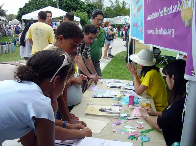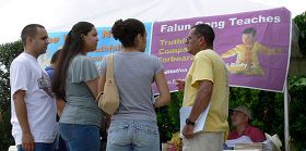 此次盛会吸引了上万人前来观看。法轮功的展示摊位恰巧位于三岔路口,来往的游人大都会路过。法轮功学员在音乐伴随中一遍又一遍的演示着舒缓优美的五套功法,现场的看板及横幅都吸引了人们的目光。很多人都好奇的询问法轮功是干什么的;有相当多的人说他们知道一些法轮功的情况,在中国被禁止;也有不少人知道法轮功是一种很好的功法,正在遭受中共的迫害,纽约等许多地方都有他们的和平抗议活动。当法轮功学员耐心细致的讲述有关法轮功、法轮功遭受的迫害、以及中共活体摘取法轮功学员器官的惊人内幕,游人们无不感到震惊、愤慨。很多人完全不受其它热闹喧天表演的吸引,也暂时忘记美食的诱惑,耐心聆听大法学员讲清真相。有几位民众在得知真相后忍不住潸然落泪,一位女士甚至泣不成声。