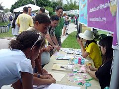法轮功学员用来赠送的纸莲花供不应求,许多人干脆就在当场跟着学员学习折纸莲花 ,他们也同时有更多时间从学员口中了解更多真相。