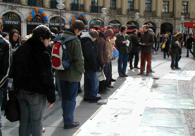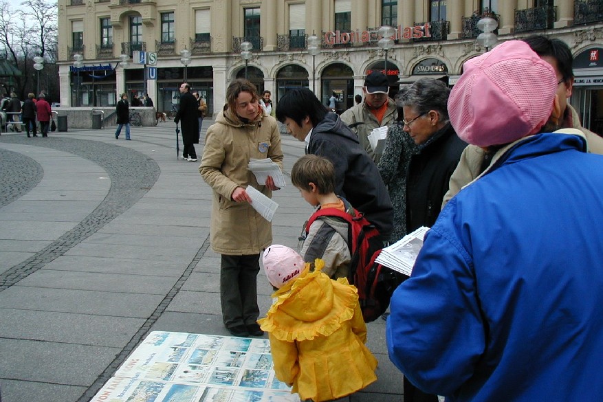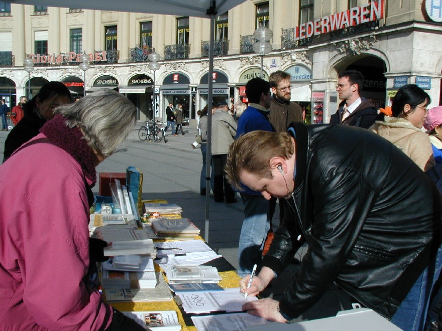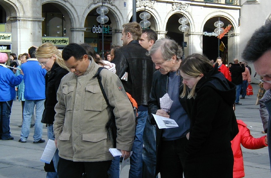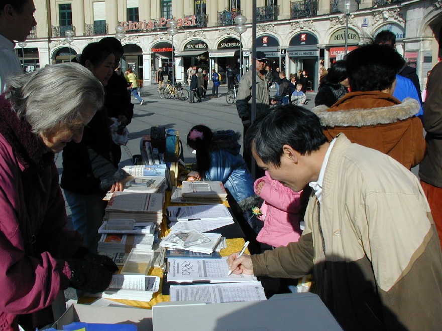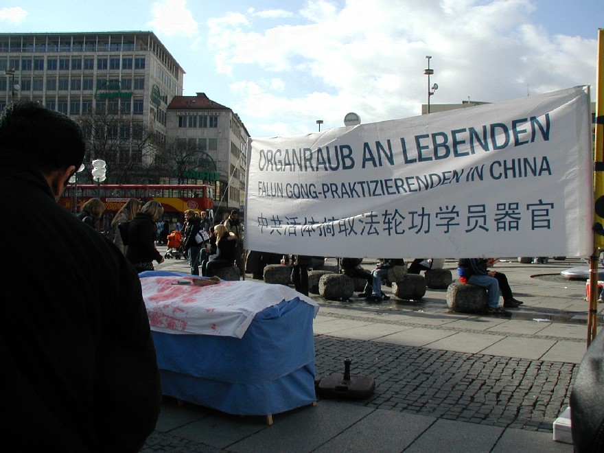 二零零七年三月十日,德国慕尼黑和周边地区的法轮功学员在市中心卡尔斯广场(Karlsplatz)举办活动,揭露中共对法轮功的残酷迫害,并声援一千九百万人退出中共。德国民众在观看了揭露中共活体摘取法轮功学员器官的模拟展和揭露中共暴政的展板后,纷纷签名,呼吁德国政府采取措施,制止中共的残暴行径。来自巴勒斯坦的策阿比·莫哈默德(Ziabi Mohamuad)是慕尼黑大学医学院的学生,他谴责(中共)这种行径,并认为这是非人行径。