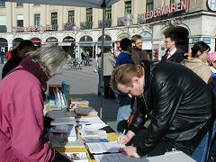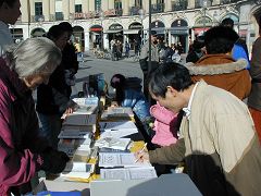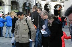一天当中有不少来自中国的旅游者和留学生路过卡尔斯广场,他们中不少人认真的看揭露中共暴政的展板,并很认真的跟法轮功学员交换意见。有些华人认为家丑不可外扬,法轮功学员郑重的告诉他们,揭露中共这些邪恶的行径是为了在全世界曝光罪恶,让正义的力量去制止中共继续虐杀法轮功学员,目地不是为了推翻中共的政权,而是让中国和全世界更多的民众觉醒,摆脱中共的欺骗和毒害,旨在挽救中国同胞,使中国人不会在“天灭中共”之际为其陪葬。一些明白了真相的人当即填写了退出中共的声明。
